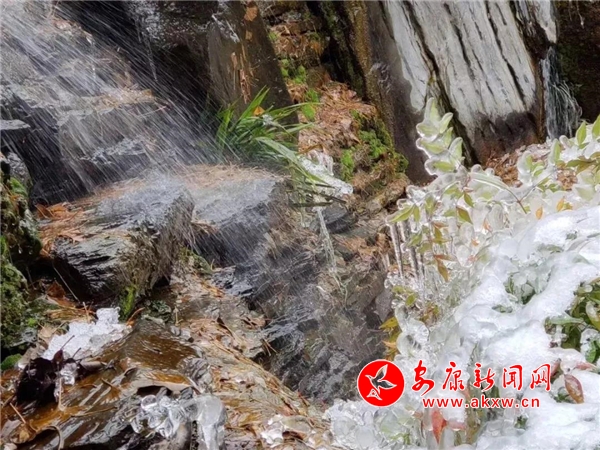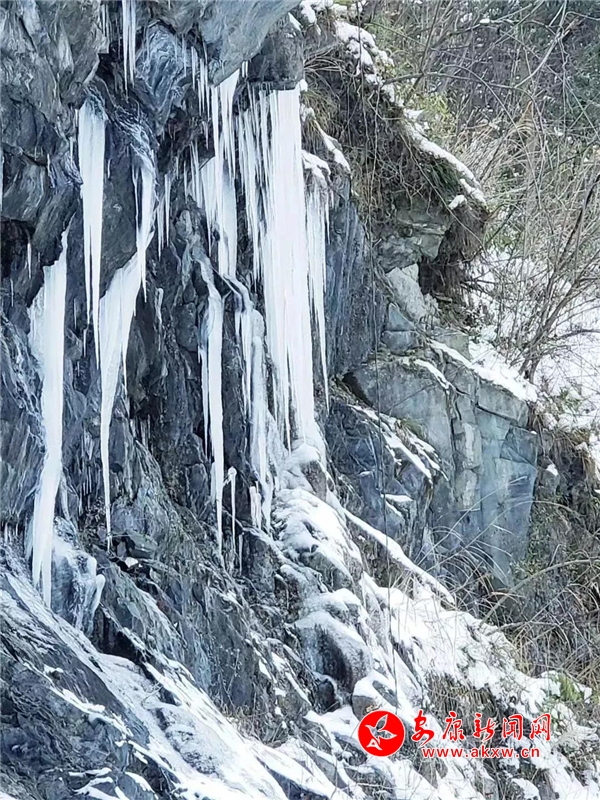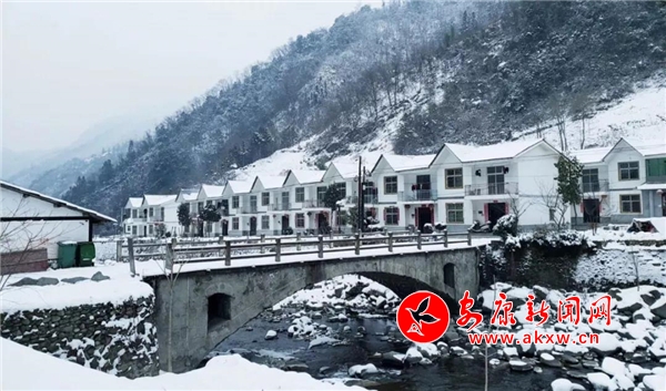 愈往深山走去,愈是銀裝素裹。發(fā)如雪,天作襯。色彩在這里失去了顏色,整個(gè)世界只剩下黑與白的構(gòu)圖。山澗中露出的黑巖,連綿著,將青絲的線條起伏蜿蜒地勾勒而出。山腳下一排排整齊的村民安置房,已顯出冬眠酣睡的樣子。樹林里帶著一層朦朧,在群山連綿中起伏著,為這雪天獻(xiàn)上了一幅絕美的水墨畫卷,也更增加了幾分神秘。