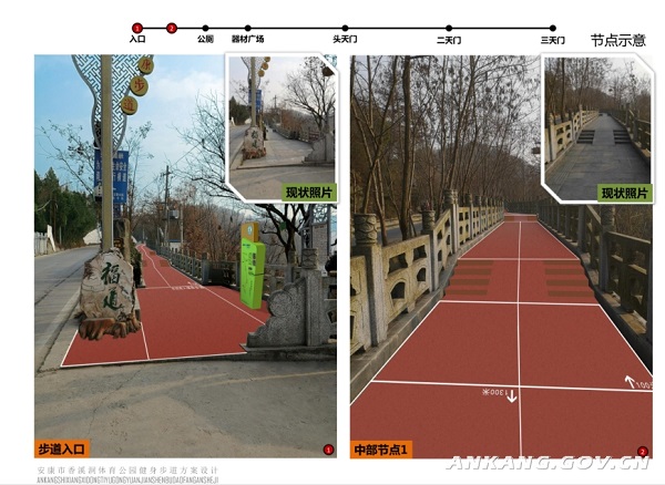項(xiàng)目實(shí)施地點(diǎn)為安康市香溪洞風(fēng)景區(qū)原有健身步道(水泥路面),北起香溪文化廣場(chǎng)南側(cè),南至香溪洞景區(qū)停車場(chǎng),全長(zhǎng)約1.5公里,寬度介于2.47—3.72米之間。
