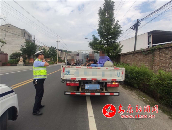 7月31日15時(shí)許,大隊(duì)執(zhí)勤民警在316國(guó)道沿線開(kāi)展路面巡邏,行至恒口東大門(mén)時(shí),發(fā)現(xiàn)一輛號(hào)牌為皖A(yù)C***C號(hào)輕型欄板貨車后車廂有違規(guī)載人嫌疑,巡邏民警立即上前攔停,示意駕駛?cè)死钅衬惩\嚱邮軝z查。經(jīng)查,該貨車核定載人數(shù)為5人,實(shí)際載9人,貨車車廂違法載客4人,屬于貨車違法載客的嚴(yán)重交通違法行為。