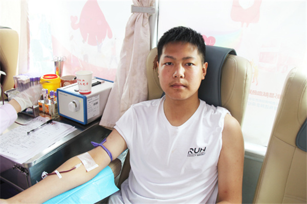 金濤濤是汽修專業(yè)四年級的學(xué)生,當(dāng)天他第一個走上獻(xiàn)血車,已經(jīng)第四次獻(xiàn)血的他顯得非常輕松。他告訴我們,自己初次獻(xiàn)血是十八歲,之后每年時間到了都主動來獻(xiàn)血,上次他還拉上了爸媽,一家三口一起獻(xiàn)了血。金濤濤覺得獻(xiàn)血特別有意義,對自己的身體有好處,還能救人,每次收到血站發(fā)來的用血短信心里都超級自豪,就想多喊幾個人一起來,他說今后一定爭取把全宿舍的人都動員起來,多獻(xiàn)血多出力多助人!