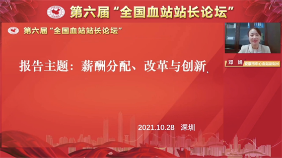 為加強全國血站的經(jīng)驗交流與合作,2021年10月27日至28日,第六屆 “全國血站站長論壇”在深圳市舉辦。中國輸血協(xié)會理事長、世界衛(wèi)生組織輸血合作中心主任朱永明,深圳市衛(wèi)健委二級巡視員林漢城等相關(guān)領(lǐng)導(dǎo)出席并致辭。此次論壇的主題是“血站建設(shè)與發(fā)展、改革與創(chuàng)新”,來自全國各省、市血液中心(血站)的同仁通過線上方式參加會議。安康市中心血站副站長鄧娟作為全國血站六個優(yōu)秀論文交流發(fā)言人之一,就安康血站績效分配、改革與創(chuàng)新工作在會上進行了經(jīng)驗交流。