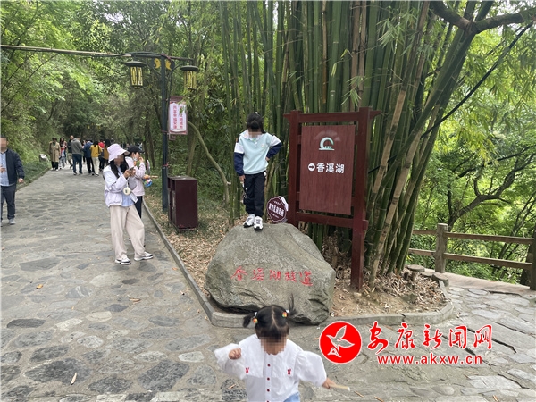 “樓閣云中建,竹木藏山巔?!薄拔逡弧逼陂g,風(fēng)景優(yōu)美、距離城區(qū)較近的香溪洞風(fēng)景區(qū)也迎來了“游客潮”。在眾多自覺遵守文明出行規(guī)則的游客中,一孩童隨意踩踏在景觀石頭上,和溫馨提示牌上的“愛護(hù)環(huán)境,文明出行”形成鮮明對比。