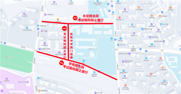 高新中學所處的學苑路東段、永定路全段、高新中學西側(cè)道路進行交通管制,禁止所有車輛通行。