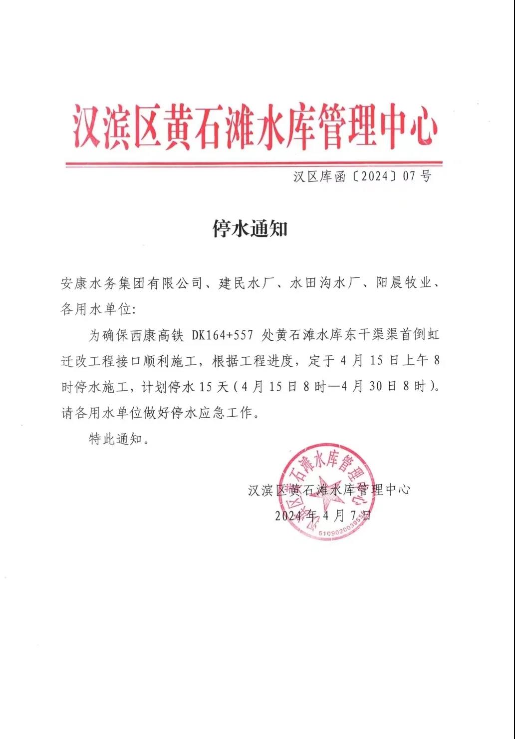 本網(wǎng)訊 4月12日,安康水務集團有限公司供水分公司發(fā)布停水通知:因西康高鐵DK164+557處與黃石灘水庫東干渠渠首倒虹豎井正交,需對東干渠倒虹進行遷改。根據(jù)遷改工程進度和供水接口轉(zhuǎn)換施工需要,將于4月15日上午8時起對黃石灘水庫干渠進行停水施工(工期15天)。
