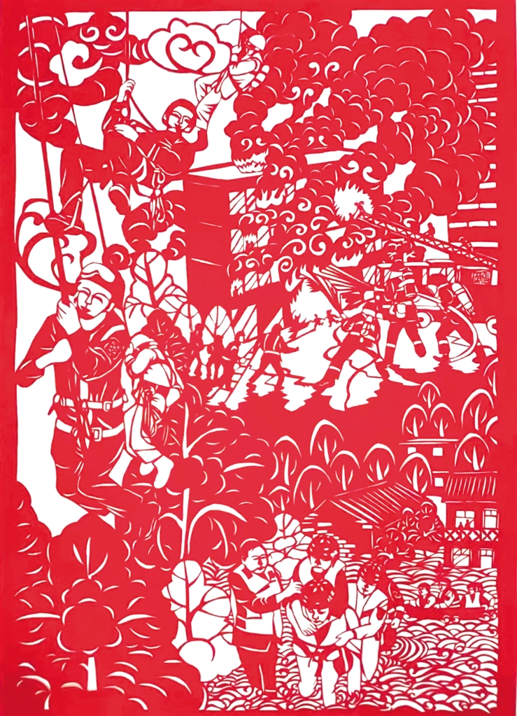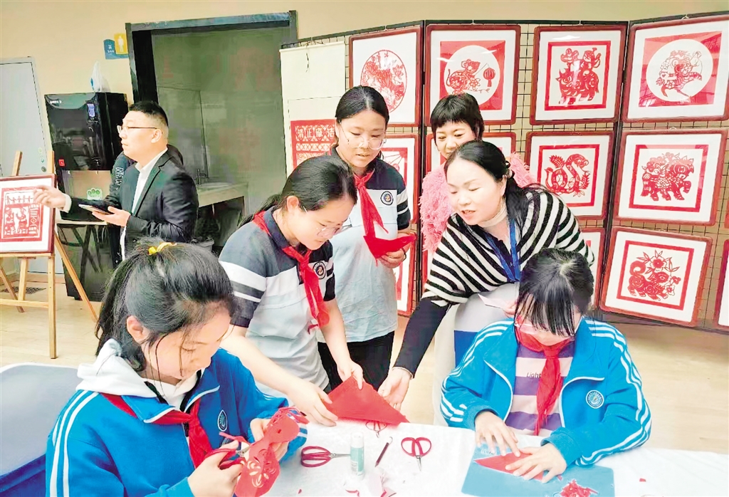 2022年,張莉的剪紙作品在“我與火焰藍(lán)”安康消防授旗訓(xùn)詞三周年風(fēng)采繪畫大賽中,榮獲“成人組優(yōu)秀作品獎”,并被主辦方收藏。2023年張莉帶隊(duì)參加“德潤安康”安康市首屆校園科技藝術(shù)節(jié),在剪紙區(qū),小隊(duì)員們發(fā)揮巧思妙想,精心設(shè)計(jì)、細(xì)心折剪,只見刀尖一開一合,紅紙不斷翻轉(zhuǎn),一幅幅栩栩如生、惟妙惟肖的作品就讓觀眾親眼見證了“刀光剪影”的神奇。隊(duì)員們嫻熟的技藝,精美的作品迅速吸引了許多人駐足參觀。
