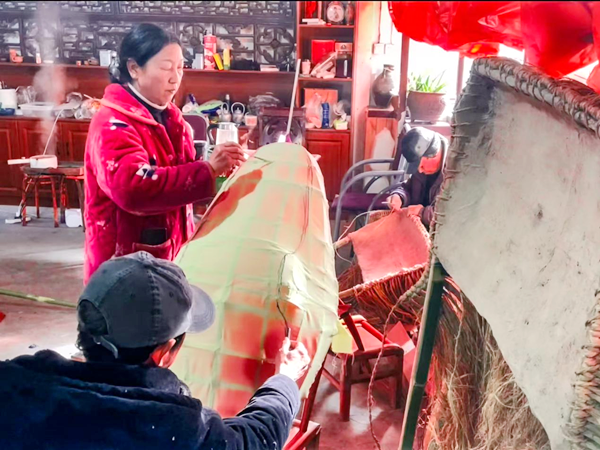 “龍頭是整條龍的重點(diǎn),刻畫要逼真,色彩還得鮮艷。忙碌了一年的鄉(xiāng)親們,就希望在正月里,抖擻精神,舞動(dòng)起來(lái)?!闭f(shuō)話間,李忠寶一雙巧手上下翻飛,正在修剪龍頭花燈的胡須,忙得額頭沁出了汗珠。兒子李石磊則忙著幫烤、粘、填、糊、上色……在他們父子倆的精雕細(xì)琢下,一個(gè)威風(fēng)凜凜、栩栩如生的花燈道具龍頭,總算扎制完成。