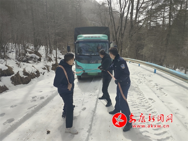 2月19日12時許,寧陜縣公安局龍王派出所值班民警接到救援電話:有一輛貨車駕駛到太山廟鎮(zhèn)太山村某路段被困,請求救助,接到電話后龍王派出所民輔警迅速趕往事發(fā)地。當(dāng)時大雪已經(jīng)下了一天,該路段因山路崎嶇坡陡,部分路面結(jié)冰打滑,民警克服天氣不利條件趕到現(xiàn)場。到現(xiàn)場后,民警看見一輛貨車被困在雪地中,民警查看現(xiàn)場環(huán)境后,利用攜帶鐵鍬、拖車?yán)K等救援物資迅速開展工作,經(jīng)過2個多小時終于安全將被困車輛牽引至安全區(qū)域。