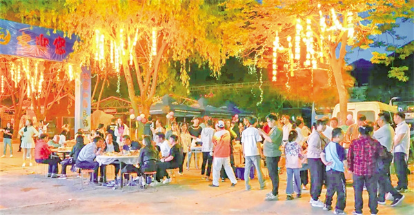 活動(dòng)現(xiàn)場(chǎng),本土樂(lè)隊(duì)、游客與特邀嘉賓輪番登臺(tái),民謠、搖滾、電子樂(lè)交織回蕩。游客們圍著篝火載歌載舞,火光映紅張張笑臉?,F(xiàn)場(chǎng)設(shè)置的文創(chuàng)產(chǎn)品和小龍蝦、燒烤等特色美食攤位更是滿足了游客的多重體驗(yàn)。