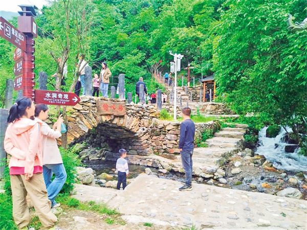 2020年以來,雙河鎮(zhèn)黨委、政府以市場(chǎng)化改革破題,號(hào)召在外創(chuàng)業(yè)能人陳守林等人回鄉(xiāng)協(xié)助開發(fā)水洞溝?!耙屬Y源變資產(chǎn),首先得打通‘任督二脈’。”陳守林介紹說:“雙河鎮(zhèn)政府累計(jì)投入資金800余萬元,治理景區(qū)河道6公里、鋪設(shè)石板步道4.5公里、搭建石拱橋6座,新建多處公廁,并完善停車場(chǎng)、旅游標(biāo)識(shí)系統(tǒng)等配套基礎(chǔ)設(shè)施?!边@一系列舉措讓“養(yǎng)在深閨”的水洞溝景區(qū),蛻變?yōu)榭蛇M(jìn)入、可游覽、可消費(fèi)的旅游目的地。