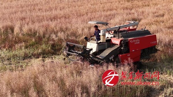 “我們有一臺(tái)直收的收割機(jī),還有兩臺(tái)分段收割的收割機(jī),比人工快多了,一畝田有個(gè)十幾分鐘就收完了?!币慌_(tái)新型現(xiàn)代化收割機(jī)在田間來回穿梭,田里的秸稈茬口整齊如梳,剛卸下的菜籽在陽(yáng)光下泛著油光。據(jù)了解,該合作社400畝示范基地全部采用機(jī)械化收割,起到了良好的示范推廣作用。