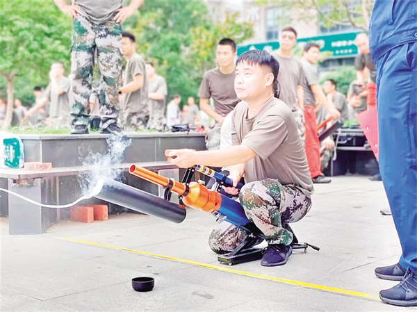 “應(yīng)急通信與拋投設(shè)備”科目賽場,科技含量高。無人機騰空而起,飛向模擬的7樓窗口查看電話號碼,衛(wèi)星電話迅速撥通,接收考官指令;拋投器精準(zhǔn)發(fā)射,命中目標(biāo)區(qū)域。