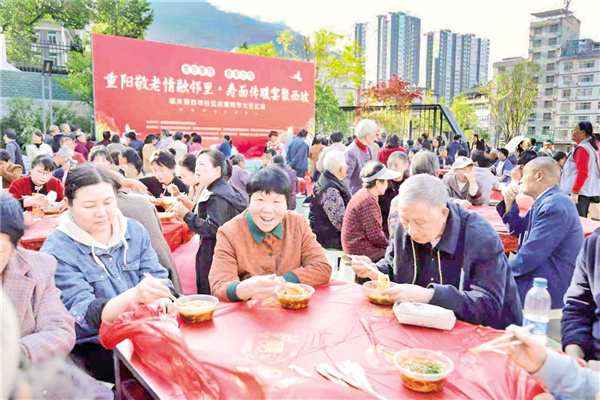 10月28日,嵐皋縣城關(guān)鎮(zhèn)西坡社區(qū)舉辦了“重陽敬老情融鄰里·壽面?zhèn)髋缇畚髌隆敝黝}活動。廖霖 攝
