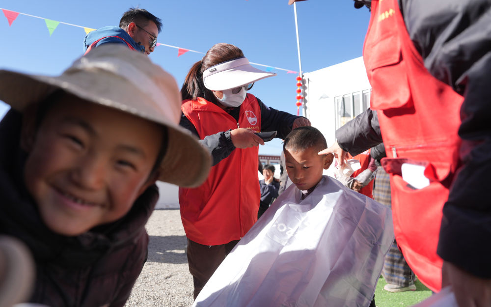 ??2025年1月26日,志愿者在西藏拉孜縣吉如村安置點(diǎn)為孩子們理發(fā)。西藏定日縣6.8級地震發(fā)生后,志愿者們迅速參與救援搜救、協(xié)助搭建帳篷、搬運(yùn)賑濟(jì)物資、協(xié)調(diào)村民所需。數(shù)百名大學(xué)生組成志愿者服務(wù)隊,白天為安置點(diǎn)的孩子們輔導(dǎo)作業(yè)、陪孩子們運(yùn)動;晚上組成巡邏隊,守護(hù)安置點(diǎn)的安寧。