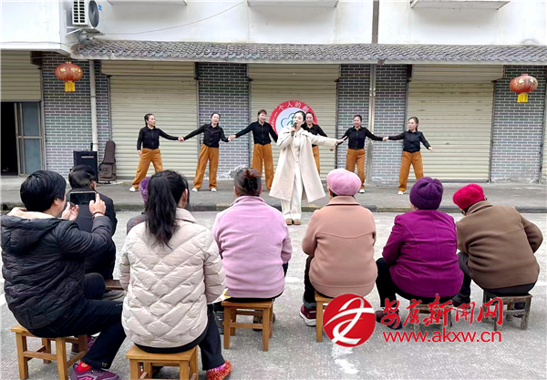 首場(chǎng)活動(dòng)在城關(guān)鎮(zhèn)湯坪社區(qū)拉開帷幕。上午9點(diǎn),演出團(tuán)隊(duì)的小巴剛開進(jìn)社區(qū)院子,志愿者們就迅速布置起臨時(shí)舞臺(tái)。隨著音樂聲響起,原本安靜的院子漸漸熱鬧起來,居民們?nèi)齼蓛蓢鷶n過來。暖陽下,志愿者早就擺好整齊的凳子,等候老人們?nèi)胱?/p>