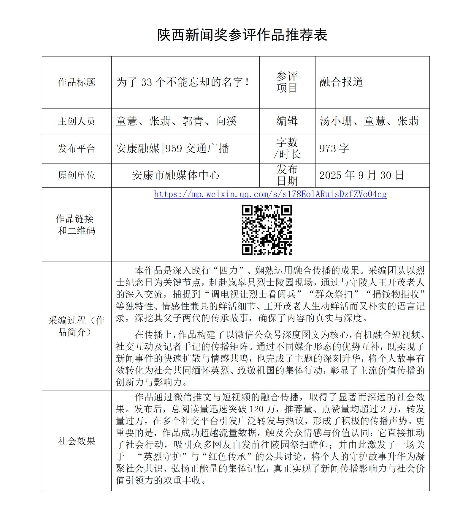 根據(jù)《陜西新聞獎(jiǎng)、陜西省優(yōu)秀新聞工作者評(píng)選辦法》和《關(guān)于開(kāi)展2025年度陜西新聞獎(jiǎng)融合報(bào)道、應(yīng)用創(chuàng)新和新媒體新聞專(zhuān)欄作品推優(yōu)工作的通知》要求,經(jīng)個(gè)人申報(bào)、部門(mén)推薦和中心編委會(huì)嚴(yán)格篩選,對(duì)以下3件2025年度陜西新聞獎(jiǎng)融合報(bào)道、應(yīng)用創(chuàng)新、新媒體新聞專(zhuān)欄參評(píng)作品進(jìn)行公示。(作品推薦表附后)