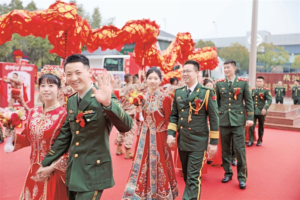 晨曦微露,新娘們身著秀禾,鬢邊珠釵搖曳;新郎們一身戎裝,身姿挺拔如松,雙方帶著滿心熾熱共同奔赴愛的殿堂。據(jù)了解,此次婚禮從籌劃之初便秉持“官兵滿意、家屬暖心”的原則,從住宿安排、婚車調(diào)度到場地布置、環(huán)節(jié)設(shè)計(jì),處處細(xì)致用心,雖然沒有奢華的排場,卻處處彰顯著軍營獨(dú)有的浪漫。