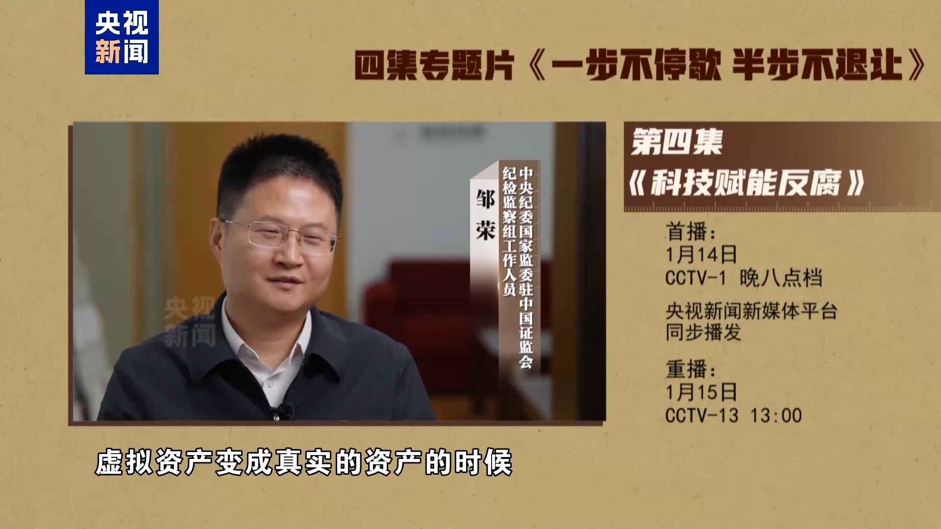 電視專題片《一步不停歇 半步不退讓》第四集《科技賦能反腐》,講述紀(jì)檢監(jiān)察機(jī)關(guān)豐富防治新型腐敗和隱性腐敗有效辦法,以信息化賦能正風(fēng)反腐,充分運(yùn)用科技手段精準(zhǔn)發(fā)現(xiàn)不正之風(fēng)和腐敗問(wèn)題線索、迅速有效突破案件,著力提升智慧反腐、科技反腐水平。總臺(tái)央視綜合頻道1月14日晚8點(diǎn)檔播出,央視新聞新媒體平臺(tái)同步播發(fā)。