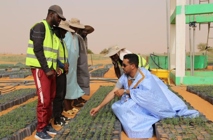 2025年5月22日,在毛里塔尼亞西部特拉扎區(qū)比爾·巴爾卡村,中非綠色技術(shù)公園毛里塔尼亞示范項(xiàng)目毛方協(xié)調(diào)員圖拉德·邁杜向工人傳授固沙植物種植技術(shù)。新華社記者 司源 攝