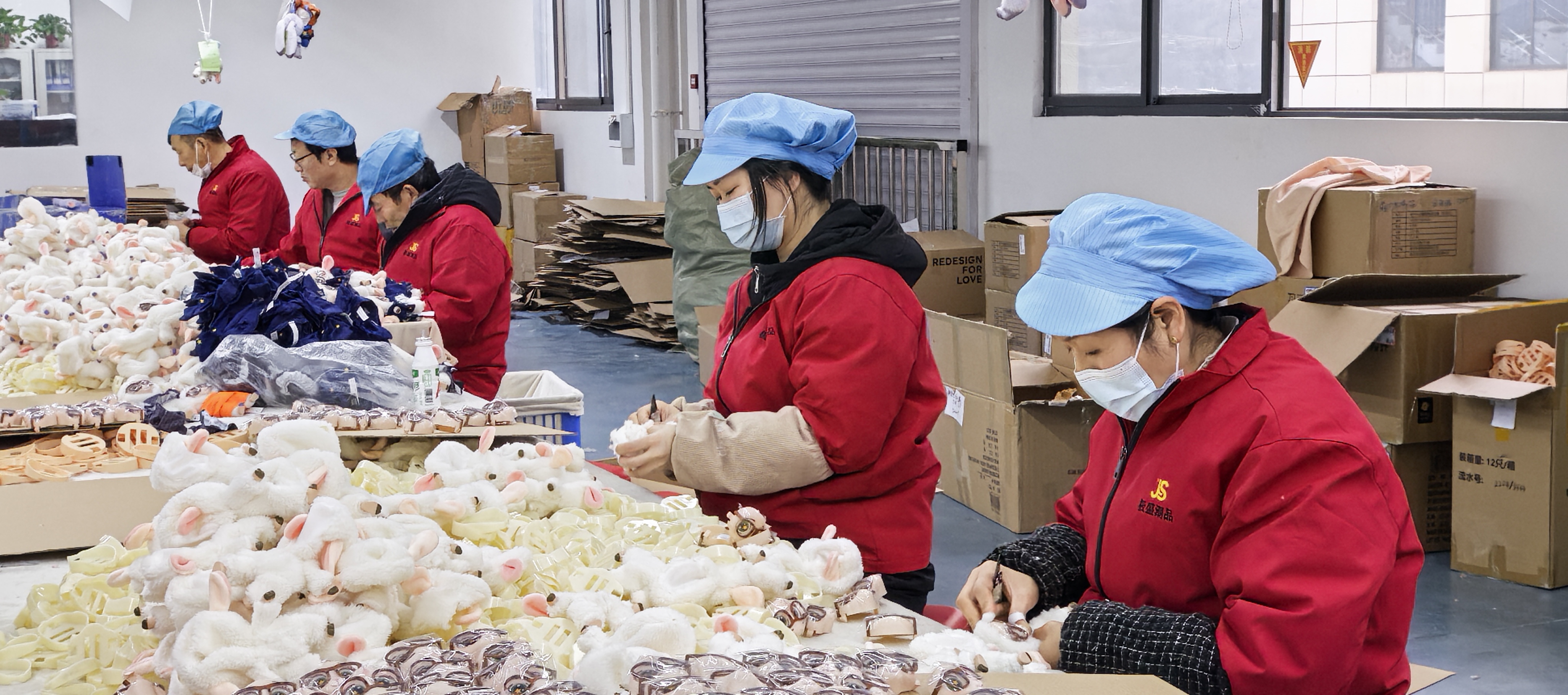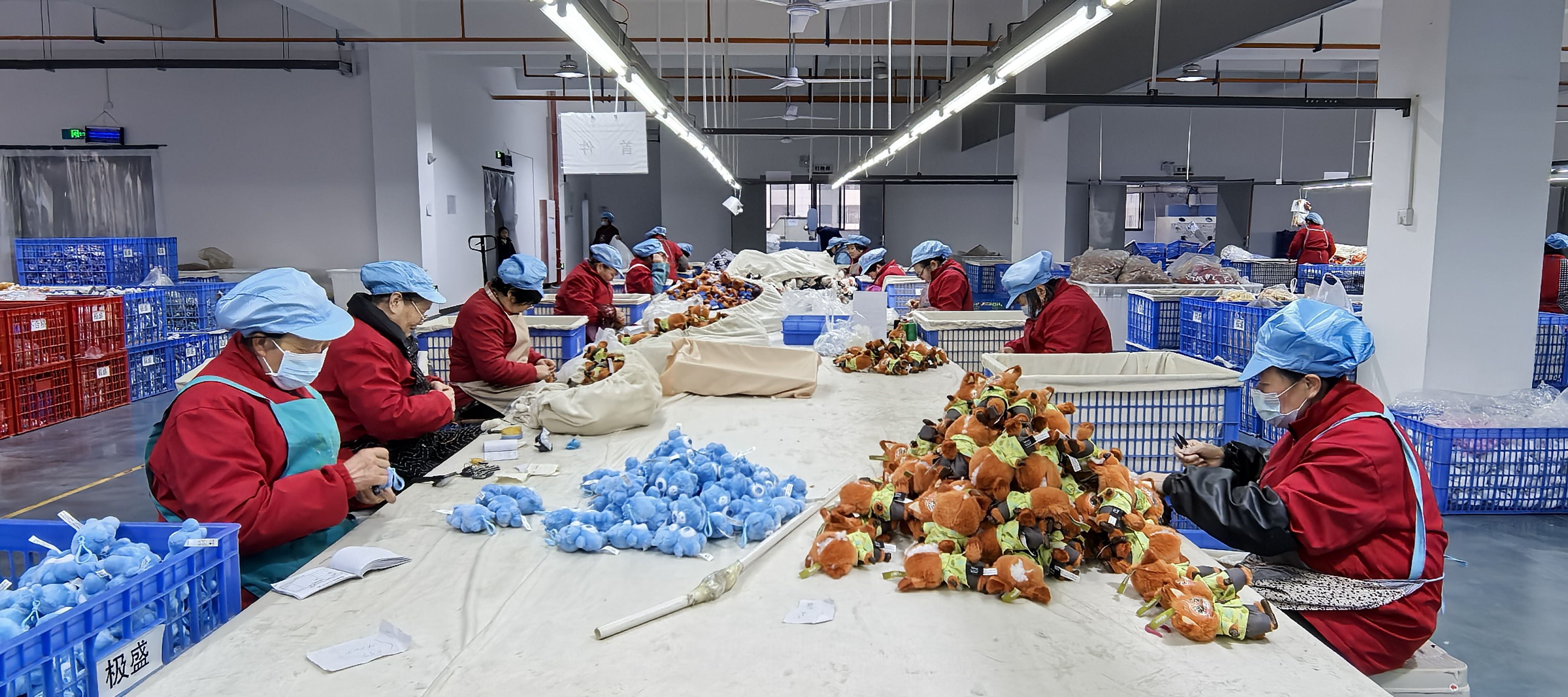 工人們正在制作熱門(mén)動(dòng)漫IP毛絨玩具。