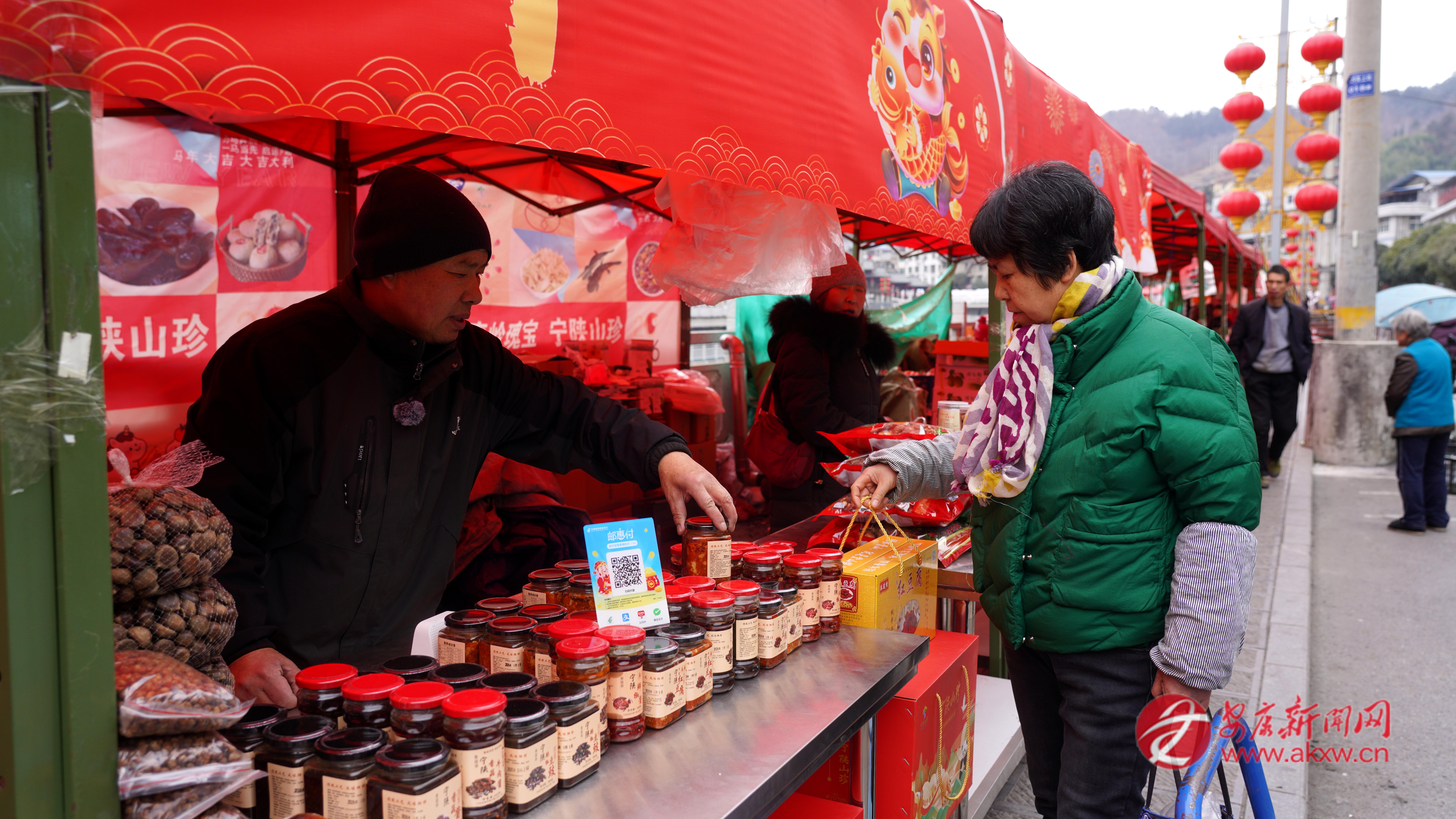 在寧陜縣城河堤?hào)|街的“年貨大集”,134個(gè)攤位整齊排布,本地臘肉油亮誘人、野生香菇厚實(shí)飽滿、土蜂蜜晶瑩剔透、木耳如墨玉般堆疊;新衣、玩具、春聯(lián)、中國結(jié)琳瑯滿目,一片喜慶祥和的景象。