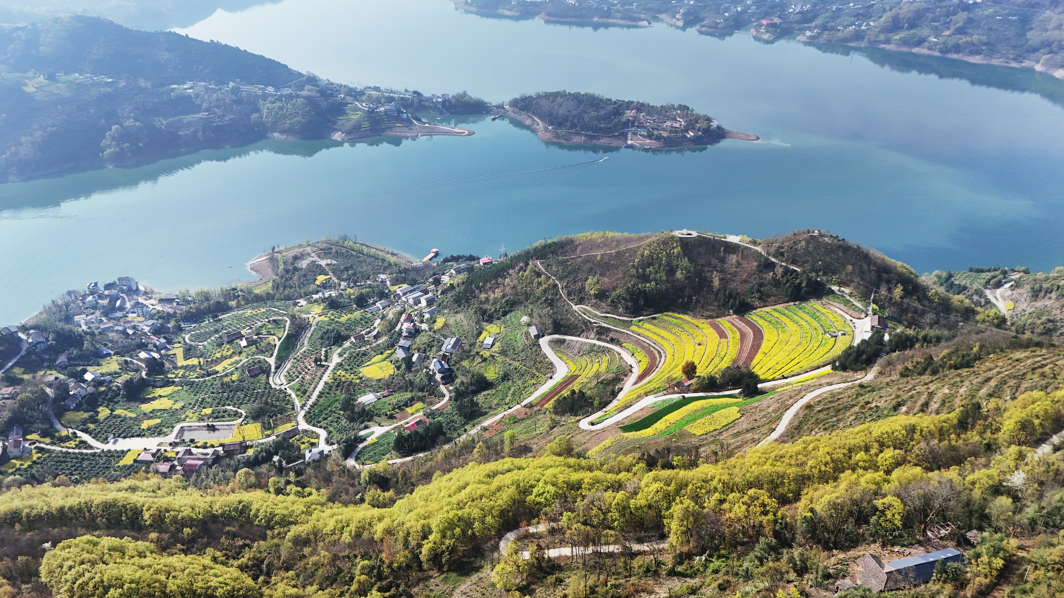 春分過后的漢江安康段沿江兩岸,桃花、櫻花、梨花、李花、油菜花等競相綻放,宛如一幅山水畫卷。圖為3月22日拍攝的漢濱區(qū)瀛湖鎮(zhèn)郭家河村春景。 趙華斌 攝