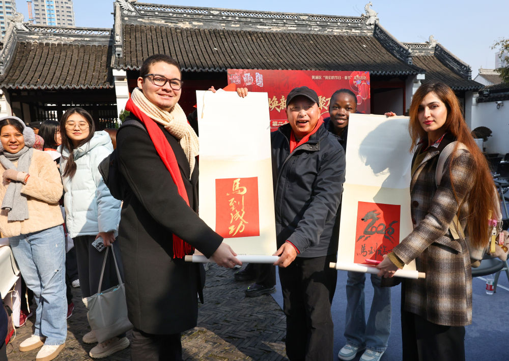 2月12日,“門煥新顏·聯(lián)聚萬家”第二十一屆老西門春聯(lián)大會(huì)在上海文廟拉開帷幕。來自巴西的留學(xué)生愛德華(前左)在展示他獲贈(zèng)的馬年主題書法作品。新華社記者 方喆 攝