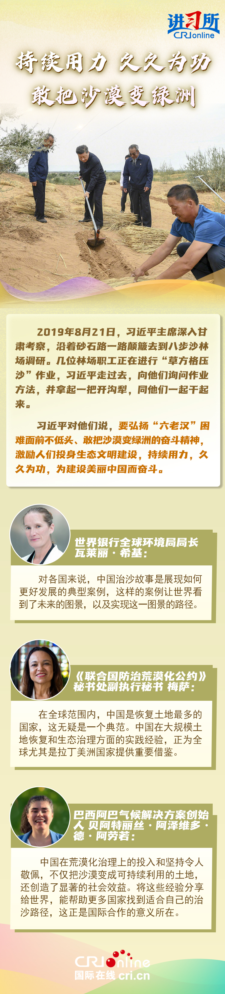 中共十八大以來(lái),中國(guó)森林面積和蓄積量持續(xù)“雙增長(zhǎng)”,荒漠化和沙化土地面積持續(xù)“雙縮減”,是全球增綠最多最快的國(guó)家。習(xí)近平主席始終身體力行:在北京連續(xù)14年參加首都義務(wù)植樹(shù)活動(dòng),在甘肅與林場(chǎng)職工一起進(jìn)行“草方格壓沙”作業(yè),在陜西親自“驗(yàn)收”秦嶺生態(tài)保護(hù)……