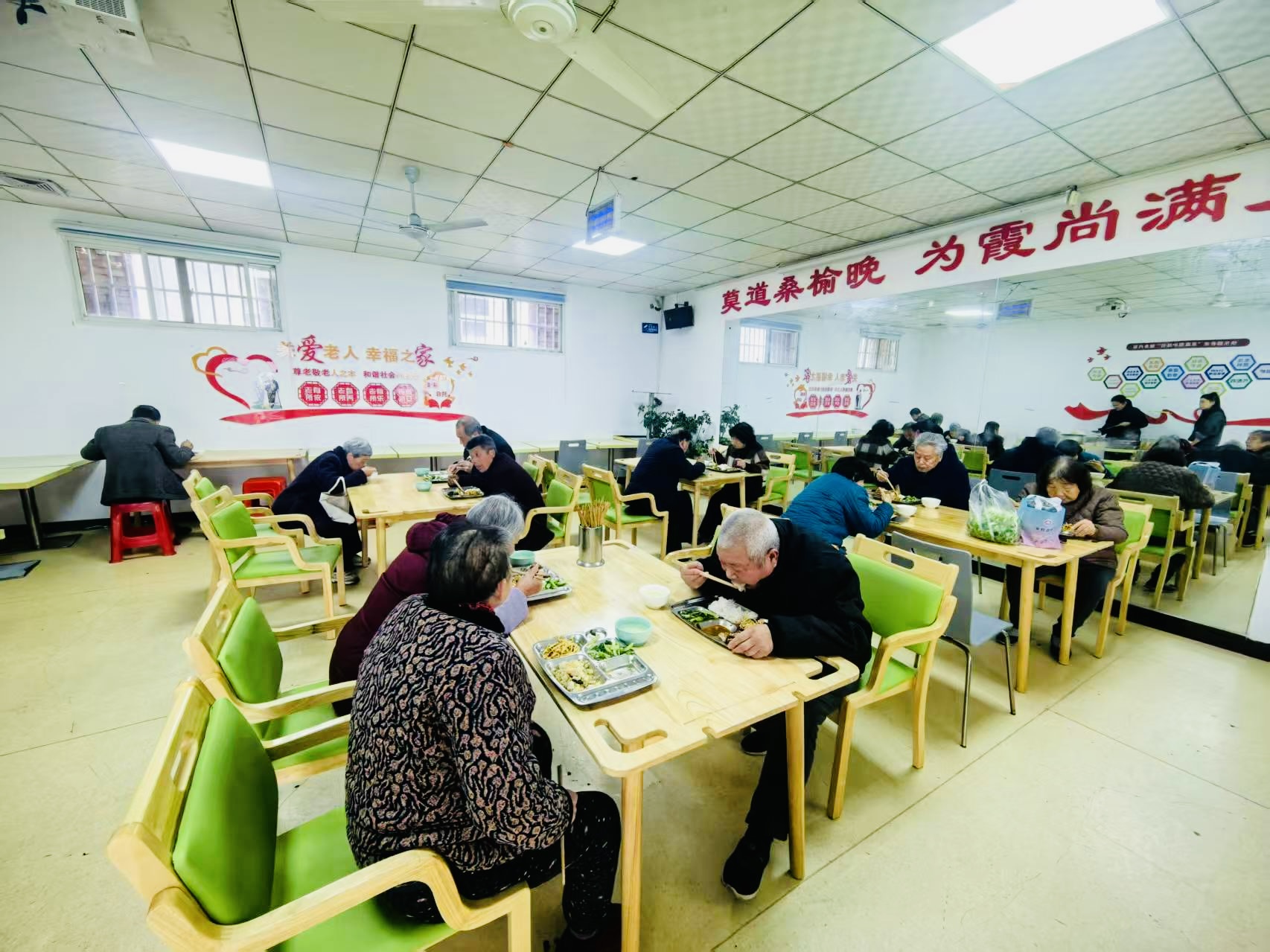“開(kāi)飯咯!”隨著廚師一聲洪亮的吆喝,社區(qū)里的老人不約而同地起身,邁著慢悠悠的步子走向餐廳。不一會(huì)兒,一道道家常菜肴就端上了桌:清炒油麥菜脆嫩爽口,酸辣土豆絲開(kāi)胃解膩,豬肉燉粉條燉得軟爛,老人不用費(fèi)牙就能咬動(dòng),再配上一碗熱氣騰騰的排骨湯,三菜一湯,葷素搭配,既可口又有營(yíng)養(yǎng)。