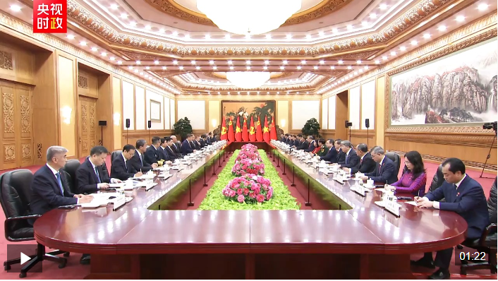 習(xí)近平指出,你當(dāng)選越南國家主席后第一時間到訪中國,體現(xiàn)了你對發(fā)展中越關(guān)系的高度重視。無論國際形勢如何變化,中方始終將越南作為周邊外交優(yōu)先方向,愿同越方秉持初心、賡續(xù)友誼,團(tuán)結(jié)協(xié)作、相互支持,高質(zhì)量推進(jìn)全面戰(zhàn)略合作,加快構(gòu)建更高水平具有戰(zhàn)略意義的中越命運(yùn)共同體。