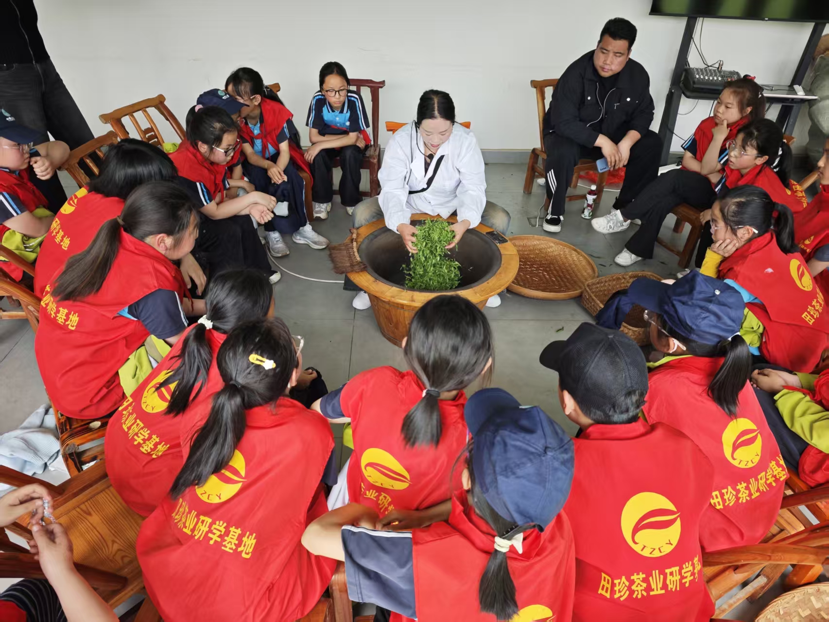 4月17日,袁因春為研學團隊教授手工制茶。 魏玉檬 攝