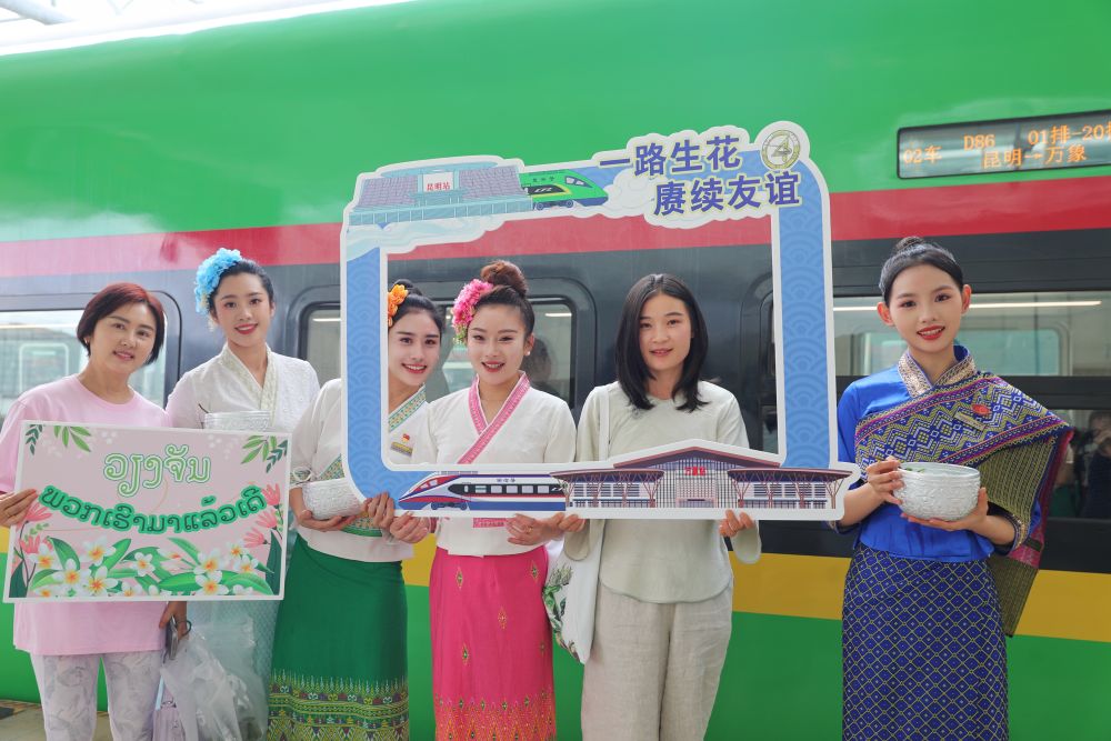 2025年7月18日,在昆明站,乘坐昆明至萬(wàn)象D86次列車(chē)的乘客與乘務(wù)員合影。新華社發(fā)(楊紫軒攝)