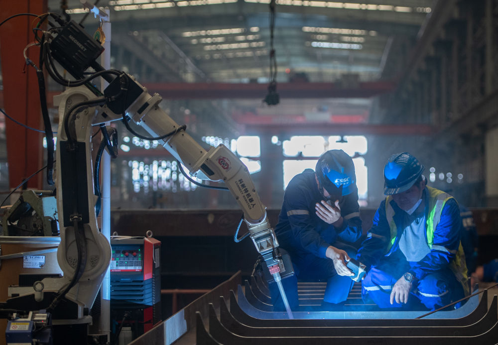 2024年5月16日,在湖北省武漢市武昌造船生產(chǎn)車間,工作人員在查看焊接機(jī)器人焊接的焊縫成型。近年來(lái),武昌船舶重工集團(tuán)有限公司圍繞新型公務(wù)船、高端海工船、中小型綠色智能油化船和支線集裝箱船等主建船型,積極推進(jìn)數(shù)字化轉(zhuǎn)型與智能制造,助力航運(yùn)高質(zhì)量發(fā)展。