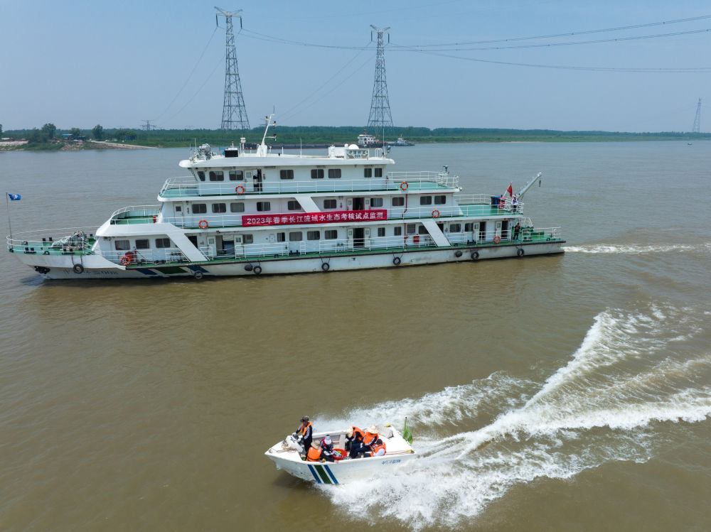 2023年5月12日,在湖北省赤壁市江段,來(lái)自長(zhǎng)江流域生態(tài)環(huán)境監(jiān)督管理局等單位的監(jiān)測(cè)人員乘坐小艇前往監(jiān)測(cè)點(diǎn)位,為長(zhǎng)江水生態(tài)“體檢”(無(wú)人機(jī)照片)。