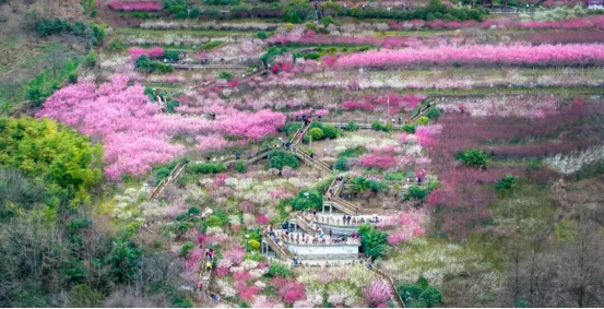 安康的春天,還在那一波接一波的花海中鋪展而成。當(dāng)春天的腳步一踏進瀛湖,這里既能體驗?zāi)ν型А⑼蟼愕人享椖繋淼男奶碳?,又能登上金螺島、翠屏島賞花,觀看漢水街的漢服巡展、非遺馬燈等系列演出,讓游客們與動物親密接觸,讓春天的故事既充滿濃郁的文化韻味,又富有十足的娛樂性。走進鳳堰古梯田,這里有明清時期湖廣移民開墾的古梯田樣本,萬畝油菜花海似指紋般層層疊疊,也似錦緞般環(huán)繞坡梁,與綠色的麥苗、潔白的梨花相互映襯,構(gòu)成了一幅絕世的春天油畫。當(dāng)春來到寧陜的子午梅苑時,萬株美人梅、朱砂梅、垂枝梅競相綻放,紅粉白黃交織在一起,一片片、一畦畦、一簇簇相映成趣,還有古琴、漢服表演和非遺展演,標志著安康春天賞花季旅游的全面開啟。在鳳凰山北邊的月河川道,自下而上,五里、恒口、漢陰的月河沿岸,由春姑娘編織出色彩斑斕的花圃,構(gòu)成了一幅百里春天月河花谷的巨幅畫卷。隨著時間推移和氣溫升高,三月中下旬,以高新桃花源、盤龍?zhí)一ü鹊葹榇淼奶一ㄒ来问㈤_,形成安康又一波桃花花海。一波接一波的花海悄然綻放,給人們帶來無盡的驚喜與感動。