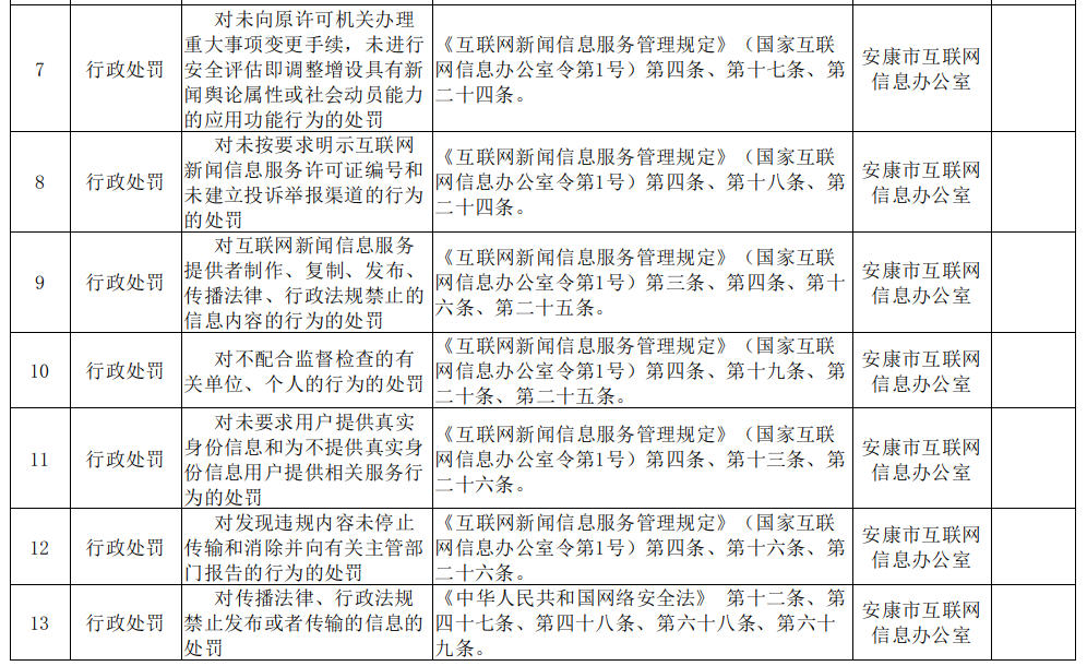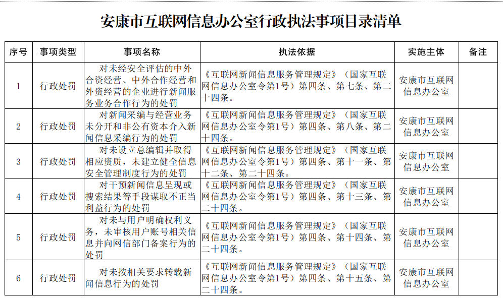 安康市互聯(lián)網(wǎng)信息辦公室行政執(zhí)法事項(xiàng)目錄清單