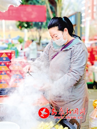 ④搬遷到白河縣城關(guān)鎮(zhèn)獅子山社區(qū)的高大姐正忙碌著自己的小吃生意。她高興地說(shuō),春節(jié)期間人流量增加,自己的生意紅火了許多。