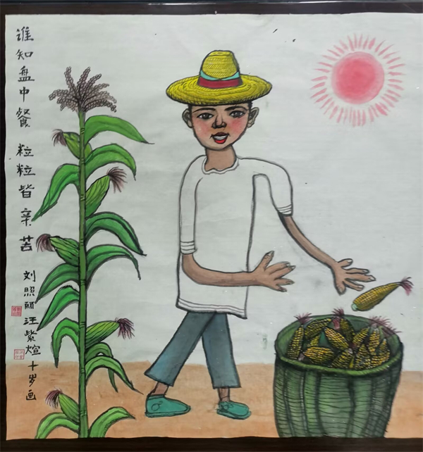 四年級的汪紫煊在參加夏令營時,在玉米田里看到一幕,深深地吸引了她,一位農(nóng)民伯伯戴著草帽在烈日下,把玉米裝進筐里。曾經(jīng)學(xué)過的詩句在她腦海里浮現(xiàn),文字變成了立體的畫面,她為自己這幅畫起名《誰知盤中餐 粒粒皆辛苦》。汪紫煊覺得,這種吃苦耐勞的精神要發(fā)揚,更要珍惜糧食,感受糧食的來之不易。