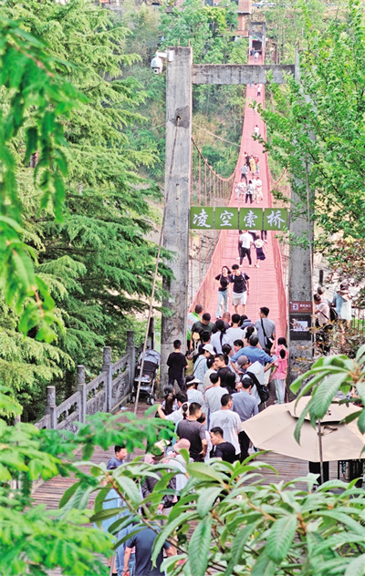 好山好水迎客來。5月3日,各地游客在紫陽縣陜甘茶馬古道景區(qū)打卡游玩。圖為游客在服務(wù)人員的引導(dǎo)下有序排隊(duì),依次踏上景區(qū)內(nèi)的凌空索橋。儲茂銀 攝