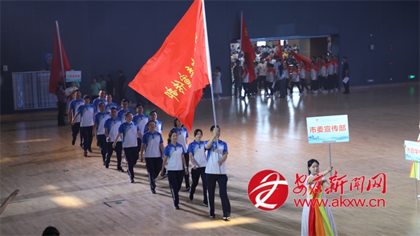 開幕式在暖場節(jié)目《幸福安康》的表演中拉開序幕。伴隨著高昂而優(yōu)美的旋律,儀仗隊隊員護(hù)擁著會旗與代表本屆市運會核心主題的標(biāo)語隊步伐矯健地入場。由全市教育、體育、科技、文化、衛(wèi)生五大領(lǐng)域的杰出代表組成的觀禮團代表從主席臺前走過。緊隨其后的裁判員隊伍、13個青少年組運動員代表團、32 個行業(yè)組運動員代表團闊步入場,展現(xiàn)出朝氣蓬勃的精神風(fēng)貌。入場儀式完畢,全場起立,面向國旗,奏唱中華人民共和國國歌。運動員代表與裁判員分別宣誓。