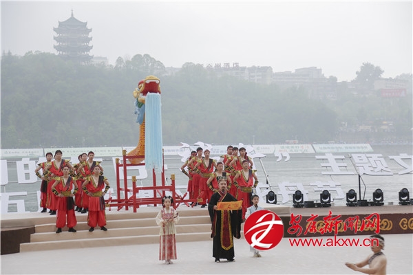 活動現(xiàn)場,6聲渾厚鐘聲劃破長空。“緬懷先賢……”隨著主祭官畫外音傳來,60名身著青綠漢服的女子手捧香粽菖蒲,踏古琴清音翩躚而出。屈原塑像被緩緩護(hù)送入舞臺中央,112名身著漢服的學(xué)童齊聲詠頌祭文的聲浪在江岸回蕩。隨著粽拋碧波,香囊、梔子花贈客,流淌千年的龍舟文化,化作平安順利、幸福安康的當(dāng)代回響。