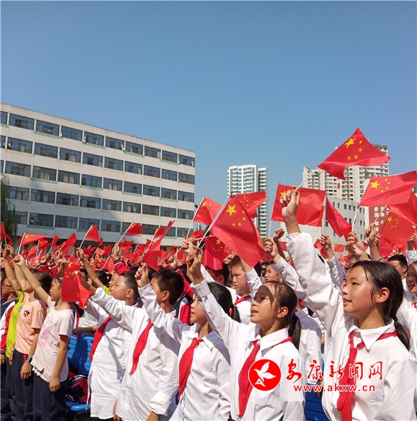 初二九班的王運城作為此次活動中的旗手,他說:“今天,能站在這里我感到很自豪,明天就是祖國母親的生日,我們在此獻歌,祝愿祖國母親永遠(yuǎn)繁榮昌盛。”