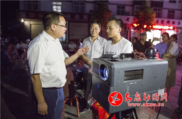 在平利老縣鎮(zhèn)西關社區(qū)廣場上,人頭攢動,群眾已經提前在銀幕前就座,社區(qū)工作人員利用影片播放前的時間開展新時代文明實踐“微課堂”,為現場群眾進行防火救災、文明禮讓、科普知識、政策法規(guī)等內容的宣講。在漢濱區(qū)縣河鎮(zhèn)安置社區(qū),影片已經開始放映,廣場上大人小孩圍坐在大銀幕前聚精會神地觀看影片。在影片播放間隙,市委宣傳部、市新農村數字電影院線公司負責同志向炎炎夏日堅守在高溫環(huán)境下的一線放映員表示感謝,并為他們發(fā)放了慰問品。