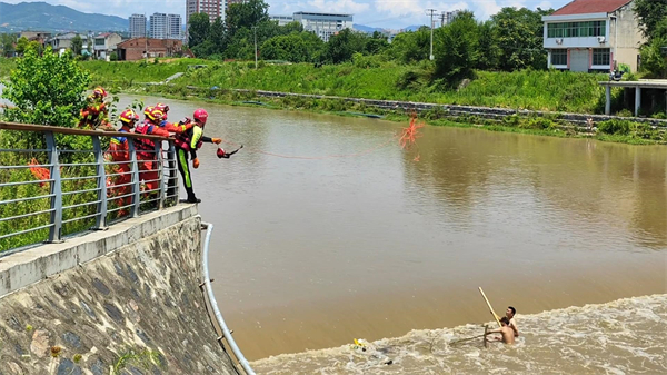水中水流又大又急,沖得王曉冬站不穩(wěn),沒(méi)辦法往岸邊去。王曉冬知道可能沒(méi)辦法憑借自己的能力上岸了,當(dāng)即決定向消防求救。“快打119!”王曉冬對(duì)岸邊的妻子大聲說(shuō)道。王曉冬一邊說(shuō)一邊將竹竿深深插入水中,他拉著孩子依靠著竹竿。