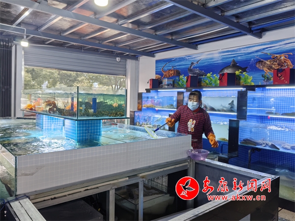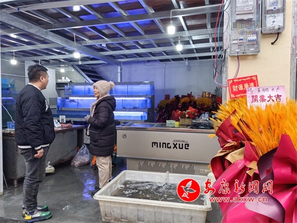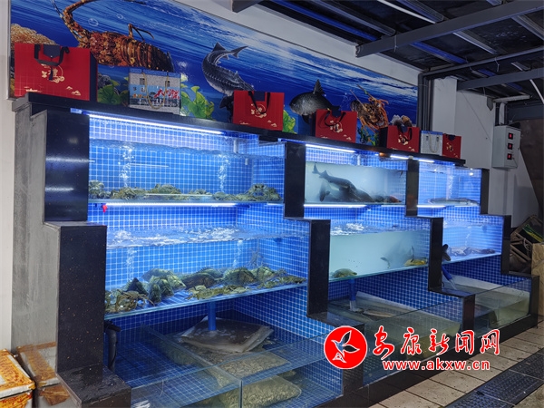 走進(jìn)水產(chǎn)品區(qū)域,店鋪里的蟹、蝦、貝等海鮮貨品齊全,價(jià)格一一寫(xiě)在魚(yú)缸上。購(gòu)買(mǎi)蝦、蟹的顧客陳女士說(shuō),“我之前在興安菜市場(chǎng)的時(shí)候就喜歡在他家買(mǎi),但原來(lái)那邊環(huán)境不太好,經(jīng)常人都下不去腳,現(xiàn)在店鋪周?chē)己芨蓛簟?rdquo;
