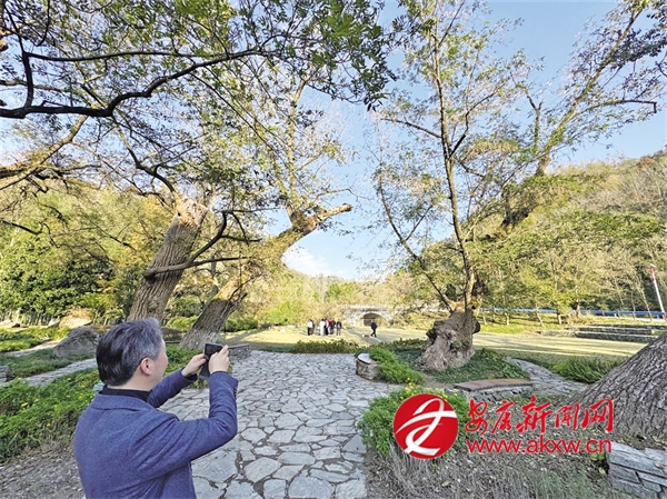 隨后采訪團(tuán)驅(qū)車駛?cè)腚p嶂村,一眼看見(jiàn)高大的“麻柳”古樹(shù)。據(jù)悉,這些古樹(shù)一共16棵,樹(shù)齡約500年。古樹(shù)的枝干或挺拔如衛(wèi)士,或斜臥似老者,繁密的枝葉織成巨傘,將整片草坪籠在樹(shù)蔭里。樹(shù)下游客紛紛舉起相機(jī)拍照,快門(mén)聲伴著歡聲笑語(yǔ)。