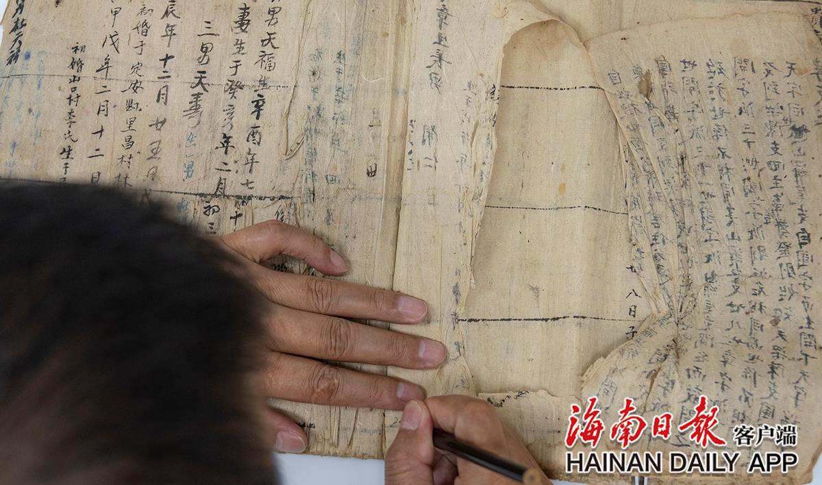 給古籍拆線前 ,黃文鋒用鉛筆標識頁碼 。海南日報記者袁琛 攝
