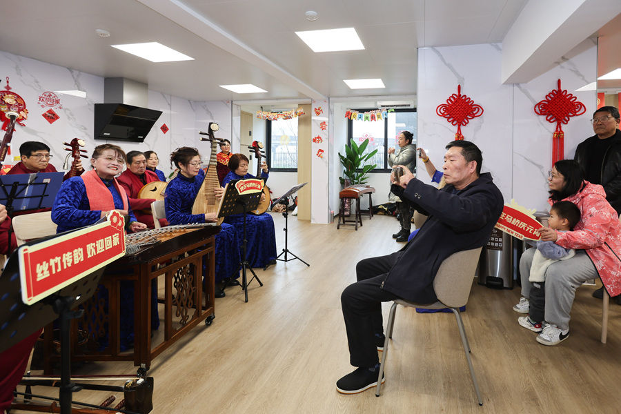 民樂隊在上海市閔行區(qū)新時代城市建設者管理者之家演奏(2024年2月23日攝)。新華社記者王翔 攝