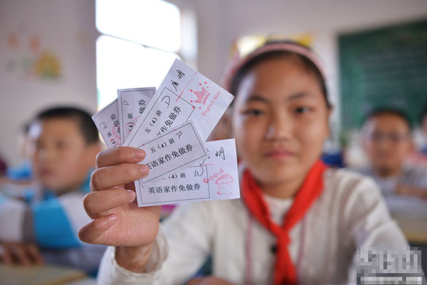 2013年10月16日,江蘇鎮(zhèn)江新區(qū)實驗小學(xué)五年級(4)班的唐玥在展示她獲得的五張“作業(yè)免做券”。封疆江 攝 圖片來源:東方IC 版權(quán)作品 請勿轉(zhuǎn)載10月16日,江蘇鎮(zhèn)……