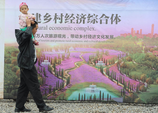 10月22日,重慶市渝北區(qū)興隆鎮(zhèn),當(dāng)?shù)卮迕駧е『⒃诘旎鶅x式現(xiàn)場參觀效果圖。當(dāng)日,重慶“五谷地意大利休閑度假農(nóng)場”正式破土動工。該項目按照意大利風(fēng)格設(shè)計,……