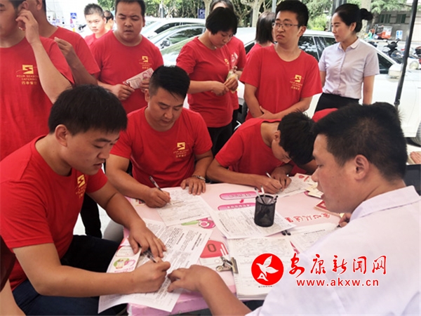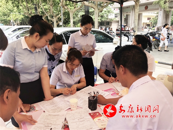 早晨的空氣格外清新,前夜的大雨帶走了不少暑氣,給了悶熱的夏日送來一絲難得的清涼。8點(diǎn)不到,安康市中心血站的獻(xiàn)血車已?吭谒募静惋嫲部蒂e館門前,等待著獻(xiàn)血者的到來。上午九點(diǎn)半,結(jié)束了例會的員工們陸續(xù)來到車前,大家圍坐在一起體檢、填表,市中心血站副站長詹勝萍,獻(xiàn)血服務(wù)科科長潘登也來到活動(dòng)現(xiàn)場,與工作人員一同做起動(dòng)員工作,詹副站長親切耐心地為獻(xiàn)血者講解血液常識,發(fā)放宣傳彩頁,叮囑獻(xiàn)血注意事項(xiàng),活動(dòng)現(xiàn)場的氣氛十分活躍。